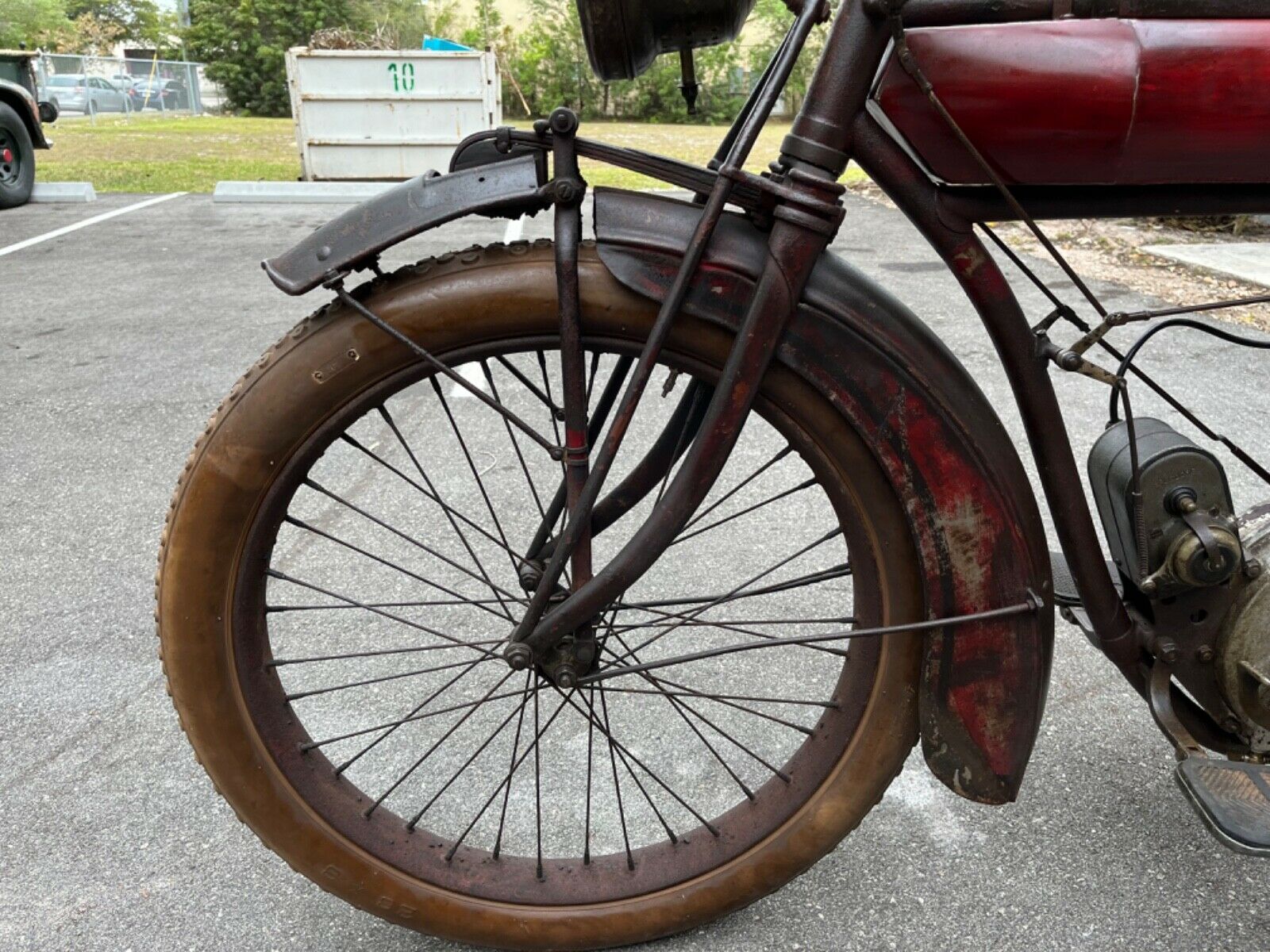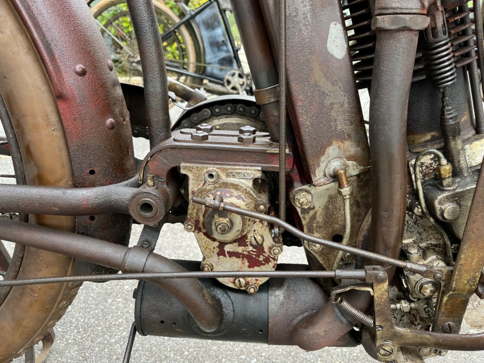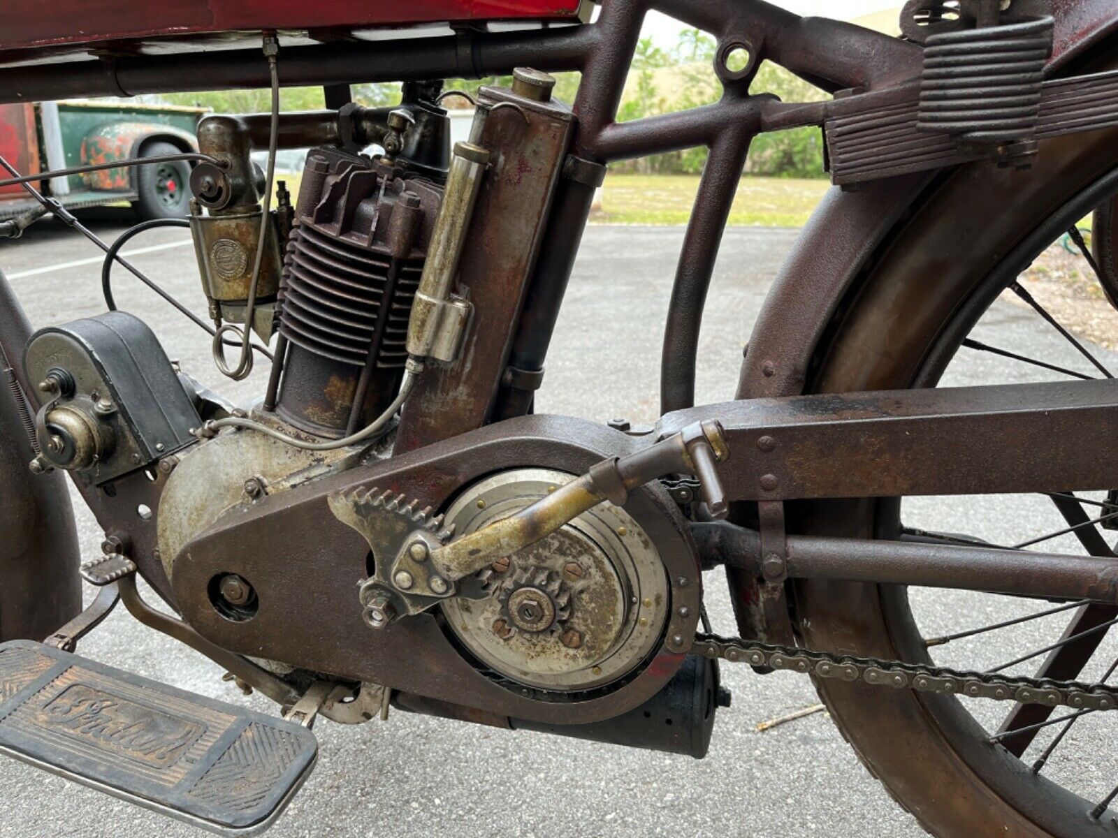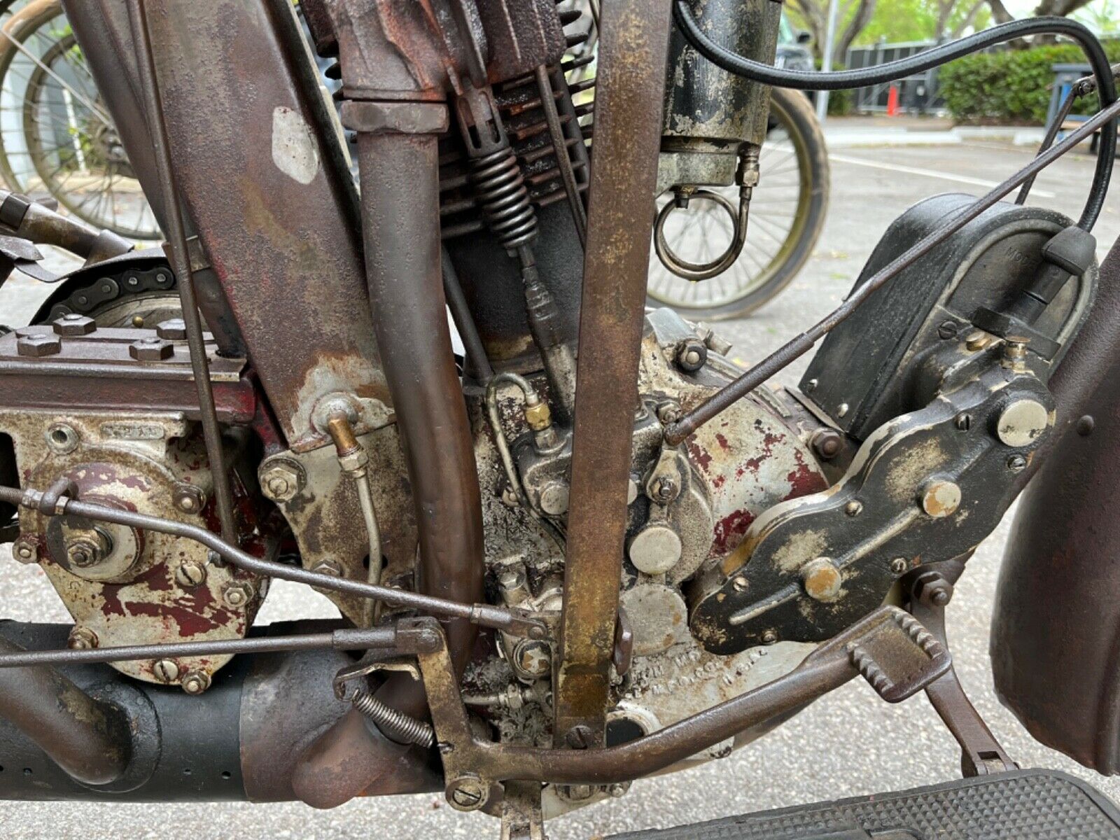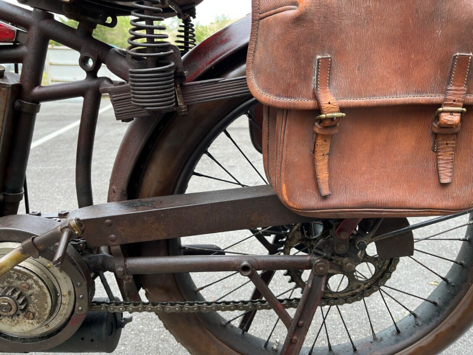 The weathered 107-year-old frame has held up well. In 1915, Indian Motorcycle started using chrome-vanadium steel alloy tubing. It also has a full leaf-spring suspension. Indian introduced its leaf spring fork in 1910, but the dual leaf springs anchoring the rear were state-of-the-art tech at the time.