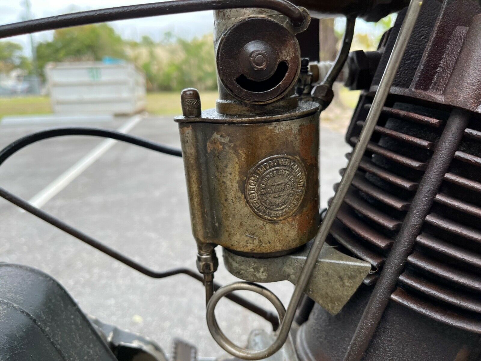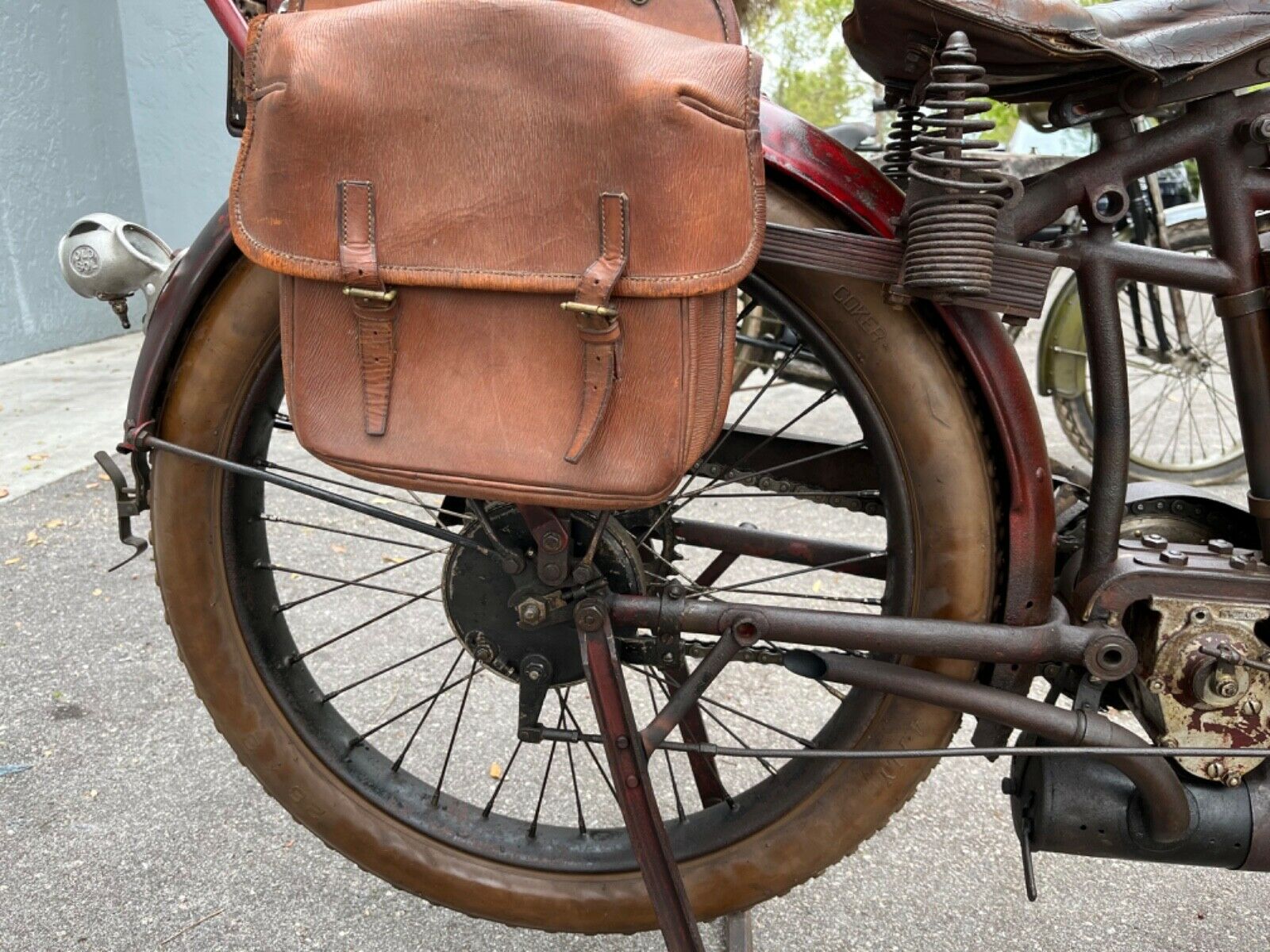 Thanks to Isam’s skills, the Indian’s little single-cylinder F-Head engine keeps thumping along. In 1915, most motorcycles made by Indian were twin-cylinder. But the company also produced a single-cylinder Model E available with a single speed, two speeds, or three. The one on eBay is the two-speed version.