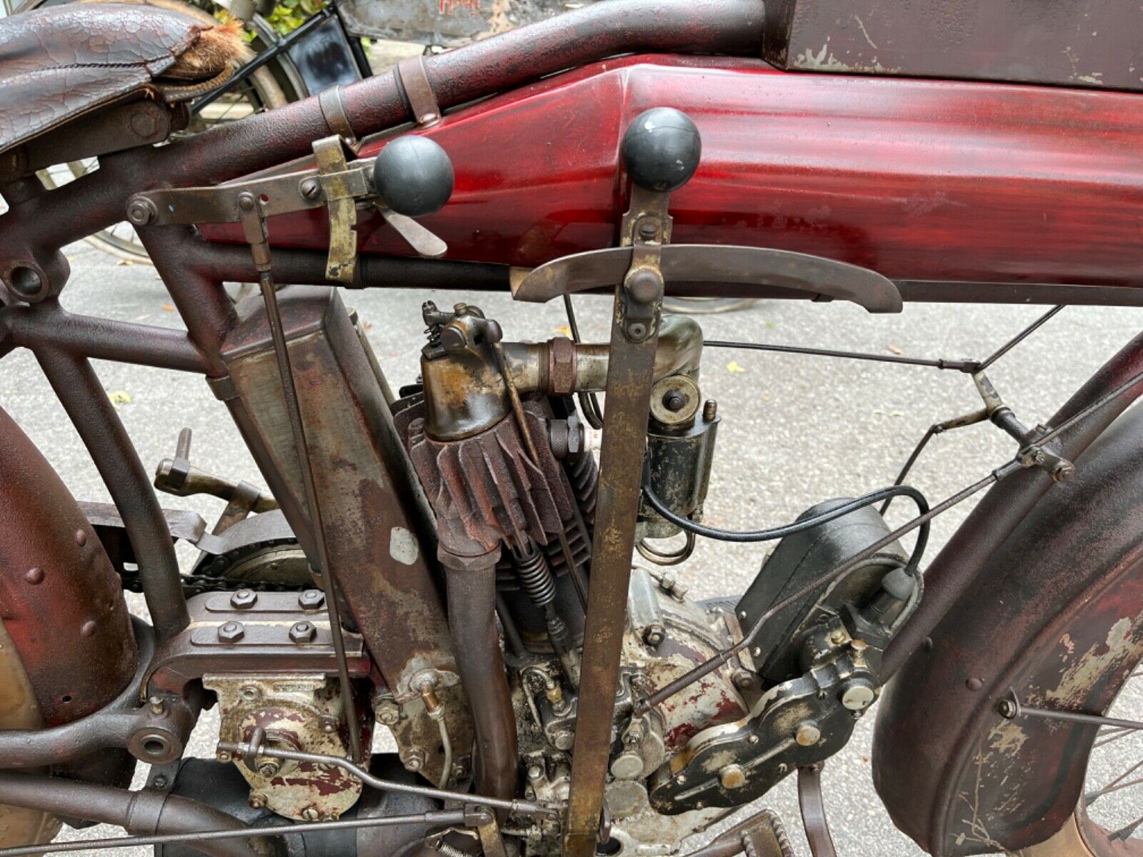 The fenders of the centenarian Indian have a splendid patina blended with patches of original Indian red paint. The Indian script is still visible on the motorcycle’s floorboards. The iconic logo debuted in 1910.