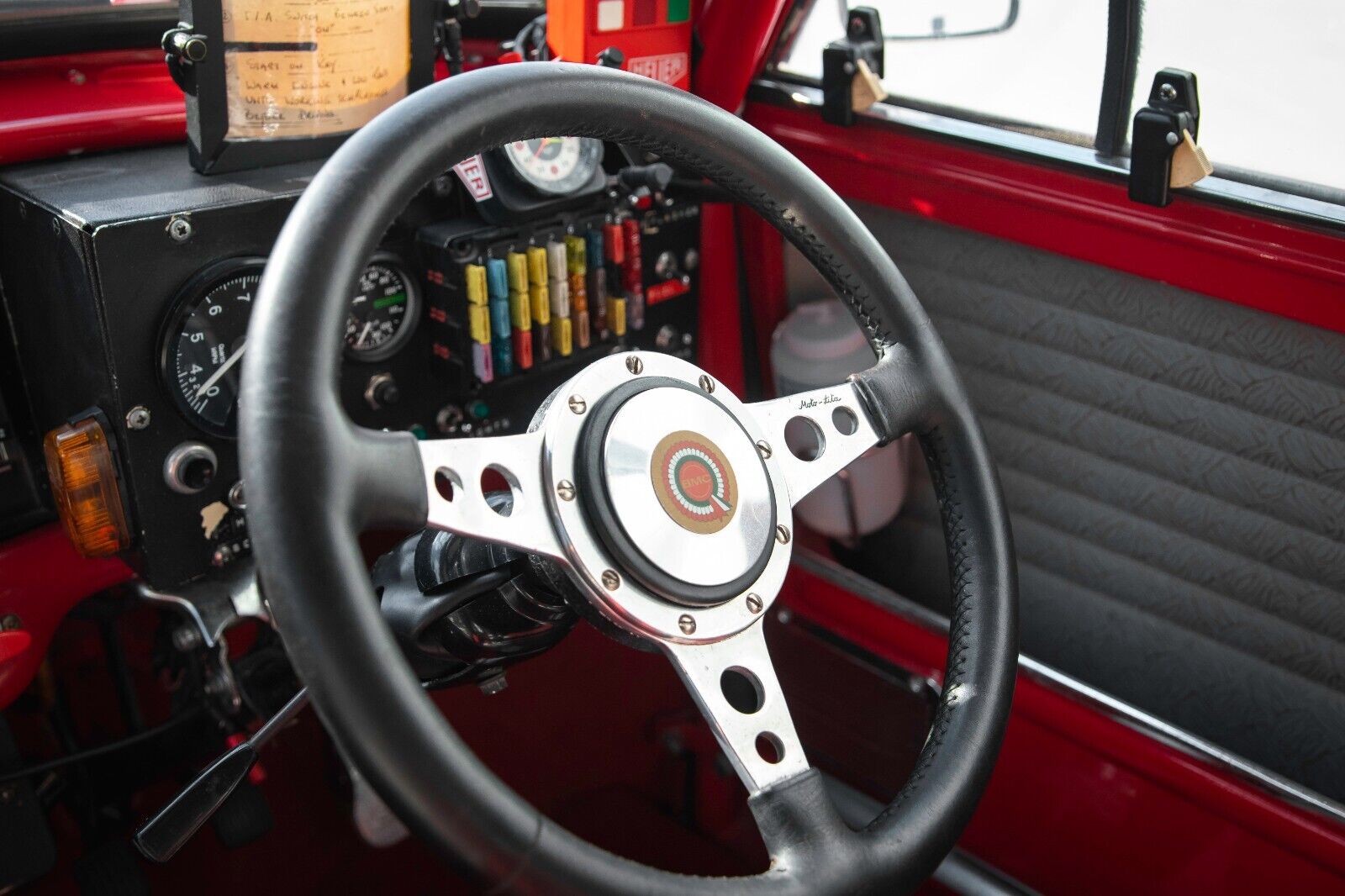 A Dural sump shield protects the oil pan from the rocky debris often found on rally stages. Koni shocks keep the wheels planted. Stopping comes from brakes with a five-diaphragm servo, seven-inch competition rotors and rear drums (with bottom protector plates), and Goodridge stainless braided brake lines. The twin fuel tanks hold 13 gallons.